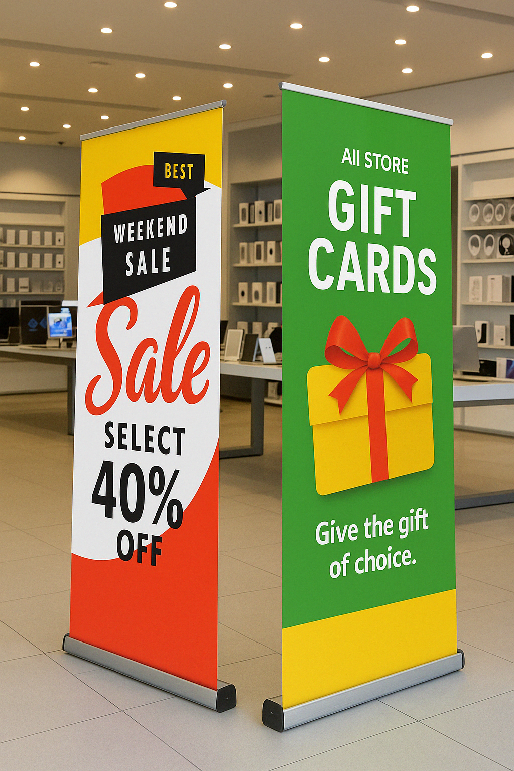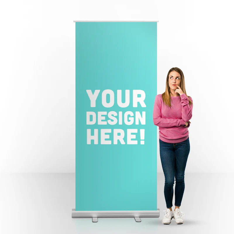 Professional retractable banner stand — sets up in seconds, includes padded travel bag. Starting at $179.